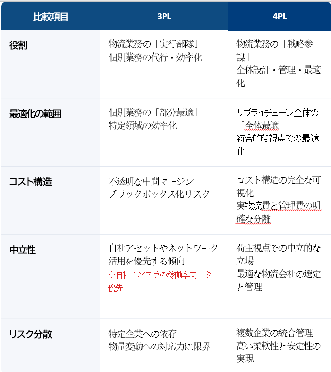 3PLと4PLの最も大きな違いは、役割と最適化の範囲にあります。