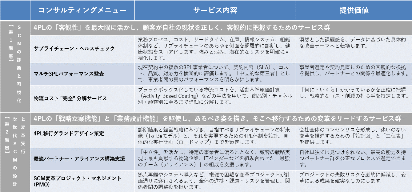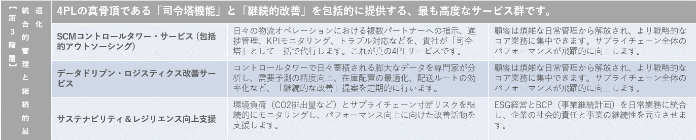 - 荷主企業の物流業務を代行する「実行部隊」です。倉庫管理、輸送、在庫管理といった個別の物流業務を請け負い、特定の領域での「部分最適」を追求します。